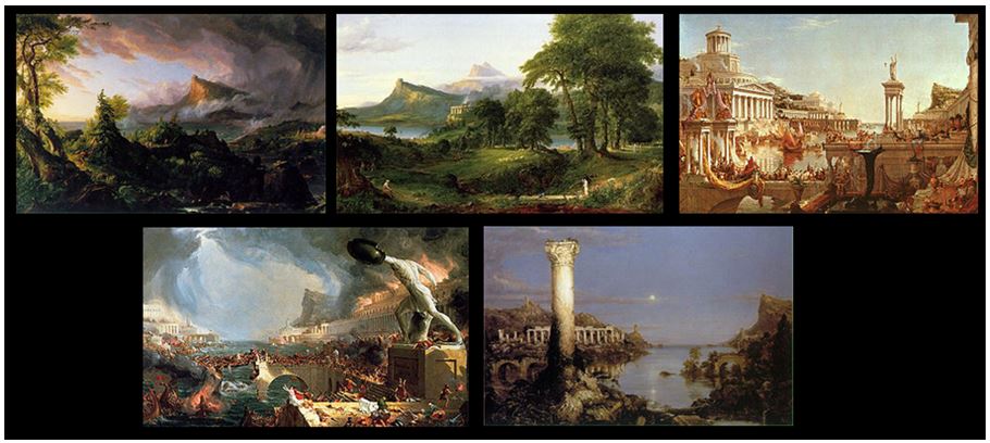 This thought was captured by Tomas Cole his ‘The Course of Empire’  Paintings (1801–48), this was an allegoric warning for the young USA: