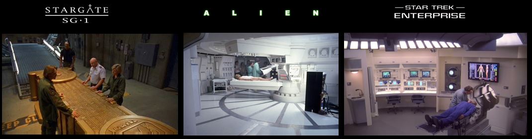 The series Stargate follows loosely the myths and religion of ancient Egypt. In their story telling, the sarcophagus of the Goa’uld (evil aliens) regenerate and prolong the lives of their human hosts. The medical bays in Alien perform a similar function. In Star Trek Enterprise the medical bay directly evokes the Christian symbolism – if you look at the entrance, you can see the cut-out of the Ringed-Cross the symbol of Christs resurrection.