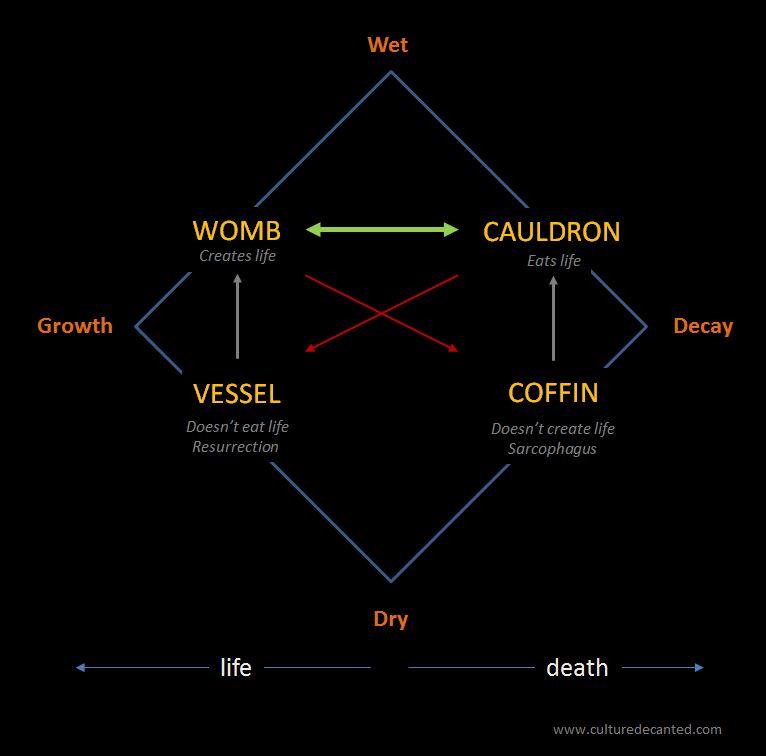 In the creation of the semiotic model of this thinking, I’ve chosen a couple of meaning axis names that some might challenge. For the ‘cauldron’, the way that I got there was by thinking through the archetypal psychology of the mother. We find that in myths and folklore, her shadow is the witch. Amongst many other characteristics, witches eat babies and children. If mothers create and nurture life, then the anti-womb must be about eating or destroying life.