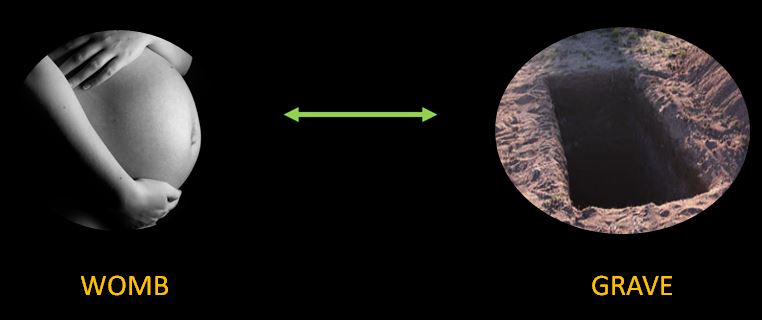 This is a powerful theme in religion which almost universally speaks to the promise of a life after this one, eg. The Life of Jesus speaks across many of these themes. He was born from Mary, into a manger (a form of cradle). The manger scene prefigures his resurrection from the Cave of Calvary – a womb symbol – transfigured through this rebirth.