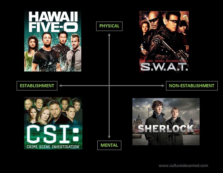 3. Mental/Non-establishment – The many Sherlock inspired shows fit into this quadrant. Intellectual assistance by a preternaturally gifted individual in deduction: Sherlock, Elementary, Mentalist, etc.