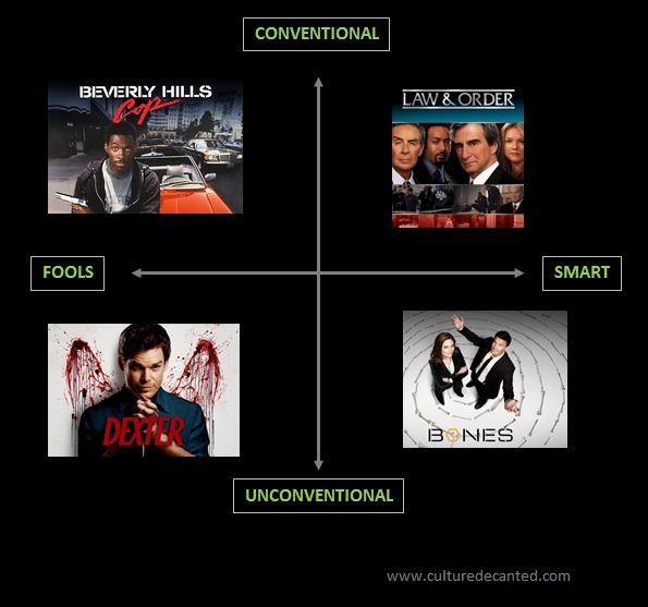 The police in Law & Order are all competent crime fighters but are frequently frustrated by the different layers of bureaucracy often holding our heroes back from making their case. In Bones, FBI Booth is paired with a forensic anthropologist in a classic IQ/EQ tango, where intellect-vs-insight misunderstandings often create the tensions.